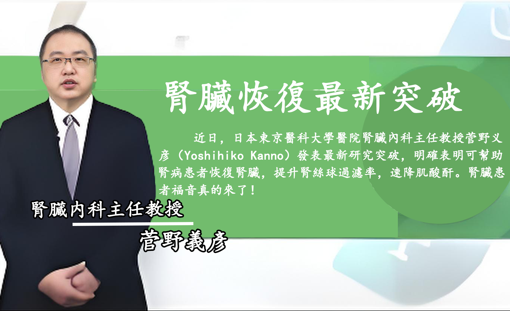 「無論是長期洗腎、透析,或多次治療無效者,只要接受菅野醫師和黃醫師聯合研發的腎臟恢復秘方,當日即可感受變化。」